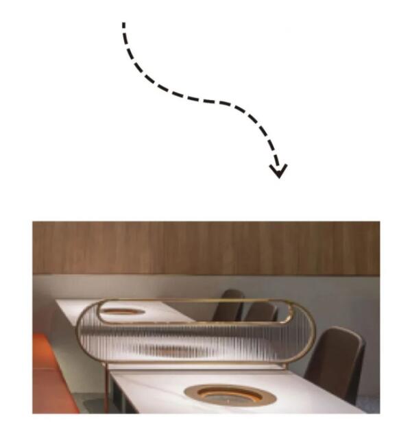 本案室內(nèi)設(shè)計(jì)以牛角元素為核心,大大小小的牛角符號(hào),在空間布局里有計(jì)劃有策略地陳列,一步步深化品牌印象。門頭是空間視覺(jué)的第一記憶點(diǎn),大牛角符號(hào)形象生動(dòng),也能令人產(chǎn)生“大牛角=牛小灶”的自然聯(lián)想,進(jìn)而讓牛小灶品牌文化在人們印象中巧妙嫁接,強(qiáng)化視覺(jué)錘的表現(xiàn)力。